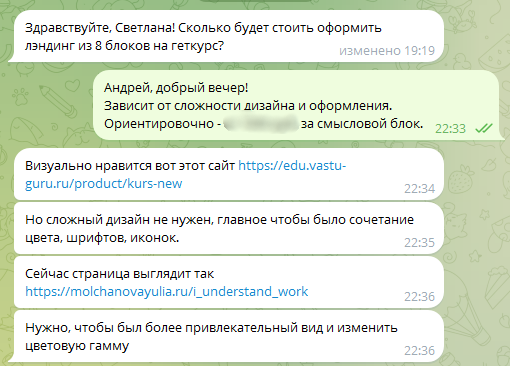 Если вам сейчас актуально привлечение новых целевых заявок, повышение узнаваемости вашего бренда, формирование доверия, то предлагаю нам созвониться на 5-10 минут, чтобы я немного глубже поняла вашу ситуацию и подготовила первый экран вашего будущего сайта или одну страницу материалов (бесплатно).