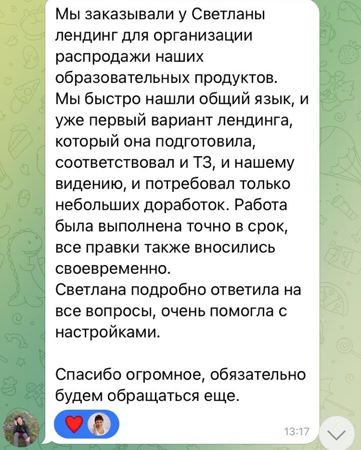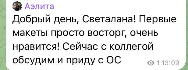 Если вам сейчас актуально привлечение новых целевых заявок, повышение узнаваемости вашего бренда, формирование доверия, то предлагаю нам созвониться на 5-10 минут, чтобы я немного глубже поняла вашу ситуацию и подготовила первый экран вашего будущего сайта или одну страницу материалов (бесплатно).